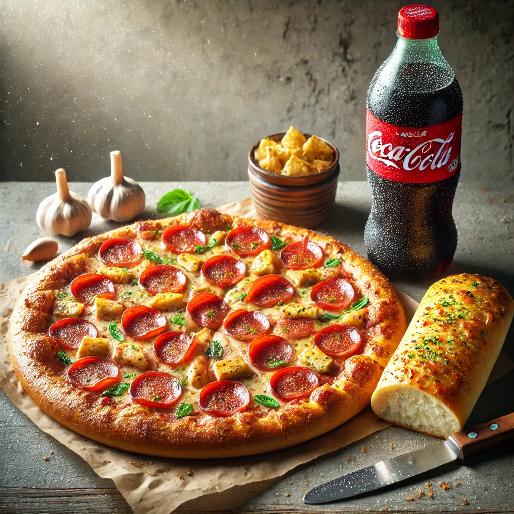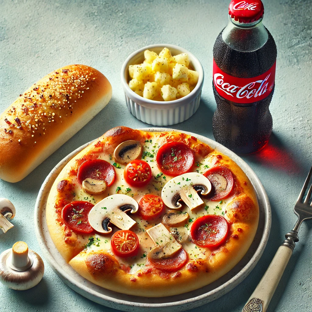 Tomato Sauce (BASE), Pepperoni, Capsicum, Fresh Tomato, Olives and Mozzarella Cheese.