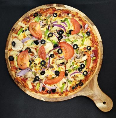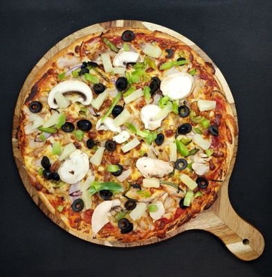 Tomato Sauce (BASE), Capsicum, Fresh Tomato, Mushrooms, Olives, Pineapple, Red Onion and Mozzarella Cheese.