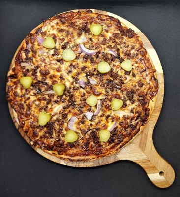 Tomato Ketchup, Beef, Pickles, Red Onion and Mozzarella Cheese.