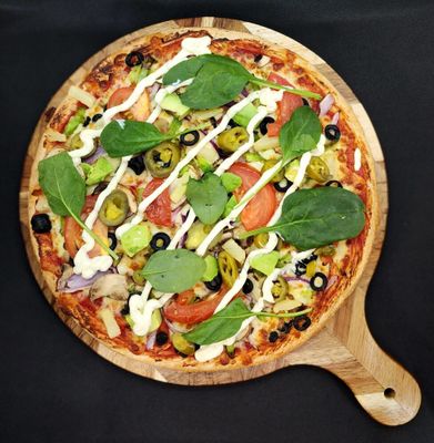 Mexicana sauce, Avocado, Capsicum, Fresh Tomato, Jalapenos, Mushrooms, Olives, Pineapple, Red Onion, Spinach, Spinach Leaves and Aioli Zig Zag.