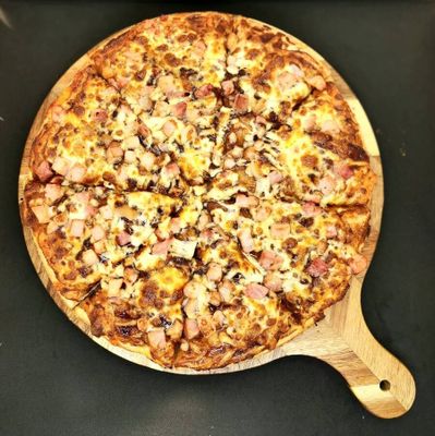 Tomato Sauce (BASE), Bacon, Chicken, Pineapple and Mozzarella Cheese.