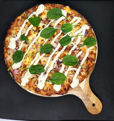 BBQ Sauce (BASE), Bacon, Chicken, Red Onion, Spinach, Mozzarella Cheese and Creamy Ranch Zig Zag.