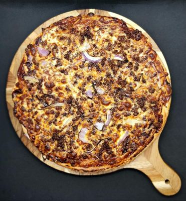 BBQ Sauce (BASE), Beef, Red Onion and Mozzarella Cheese.