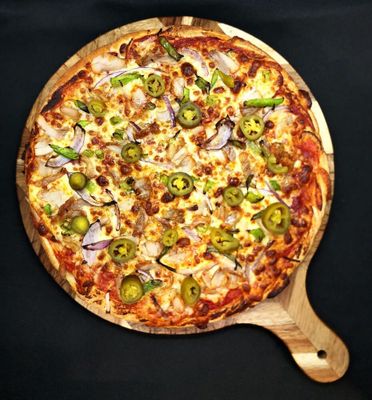 Tomato Chilli (BASE), Pepperoni, Capsicum, Jalapenos, Red Onion, Mozzarella Cheese and Chilli Flakes.