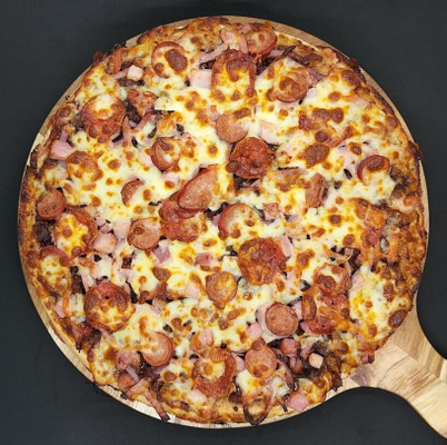 BBQ Sauce (BASE), Bacon, Beef, Cabanossi, Ham, Pepperoni and Mozzarella Cheese.