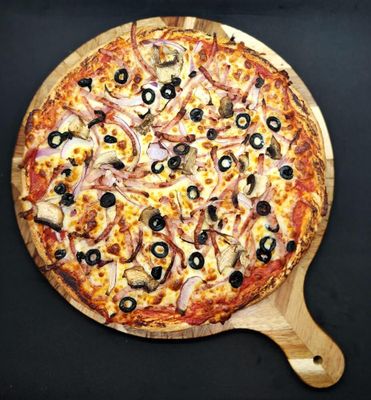 Tomato Sauce (BASE), Ham, Mushrooms, Olives, Red Onion and Mozzarella Cheese.