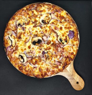 Tomato Sauce (BASE), Bacon, Egg, Capsicum, Mushrooms, Red Onion and Mozzarella Cheese.